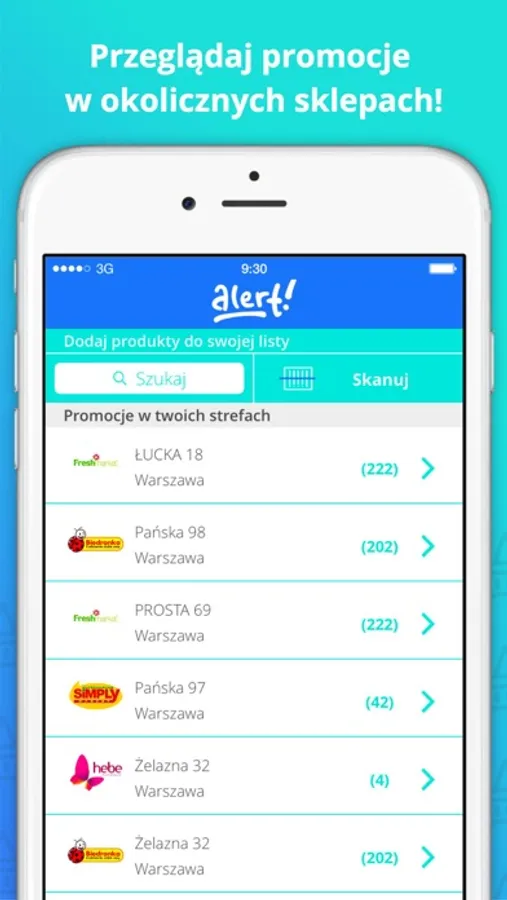 - obszerny zasięg działania aplikacji; nasza baza sklepów objętych monitorowaniem promocji należy do największych w kraju, dzięki AlertBasket znajdziesz informacje o promocjach w sieciach handlowych takich jak: Tesco, Auchan, Lidl, Biedronka, Carrefour, E.Leclerc, Alma, Piotr i Paweł, Real, Kaufland, Rossmann, Super-Pharm, Hebe, Freshmarket, Żabka, Lewiatan, Stokrotka i wiele innych