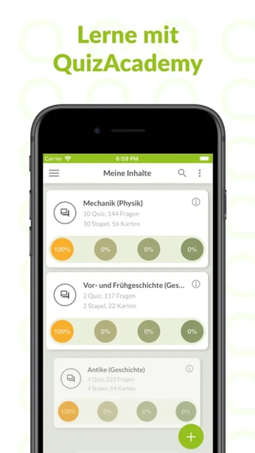 Mit QuizAcademy kannst Du die als Quiz und Karteikarten aufbereiteten Lehrinhalte Deiner Professoren und Dozenten jederzeit und überall (auch offline) lernen. Der Fokus unserer Lernplattform liegt darin Dir Funktionen zum Lernen bereitzustellen die Dir beim Lernen helfen und Dir dabei noch Spaß machen. So kannst Du Dir über QuizAcademy bspw. Deine eigene Lern-Session zusammenstellen und nur das lernen, was Du gerade lernen möchtest. Oder Du nutzt unseren Lern-Plan, der Dir durch einen intelligenten Algorithmus sagt, was Du lernen solltest, damit Du Deine Inhalte bis zur Prüfung beherrschst. Neben einigen Gamification-Modi bieten wir auch eine Live-Quiz-Funktion und eine E-Prüfungs-Funktion die direkt im Unterricht eingesetzt werden kann. Umfangreiche Analysen erlauben es Dir, Deinen Lernfortschritt zu beobachten und Problembereiche frühzeitig zu identifizieren.