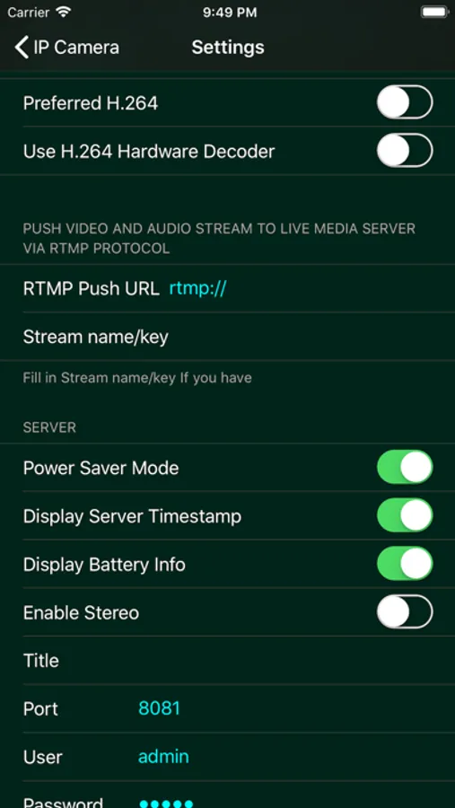 "IP Camera Lite" can push the video and audio to RTMP/SRT live media server (e.g. Push to YouTube, Facebook), and use for network broadcast. It also supports the rtmps security protocol and SRT protocol and it can also push the media to multiple media server at the same time. You can turn it on from IP Camera Server.