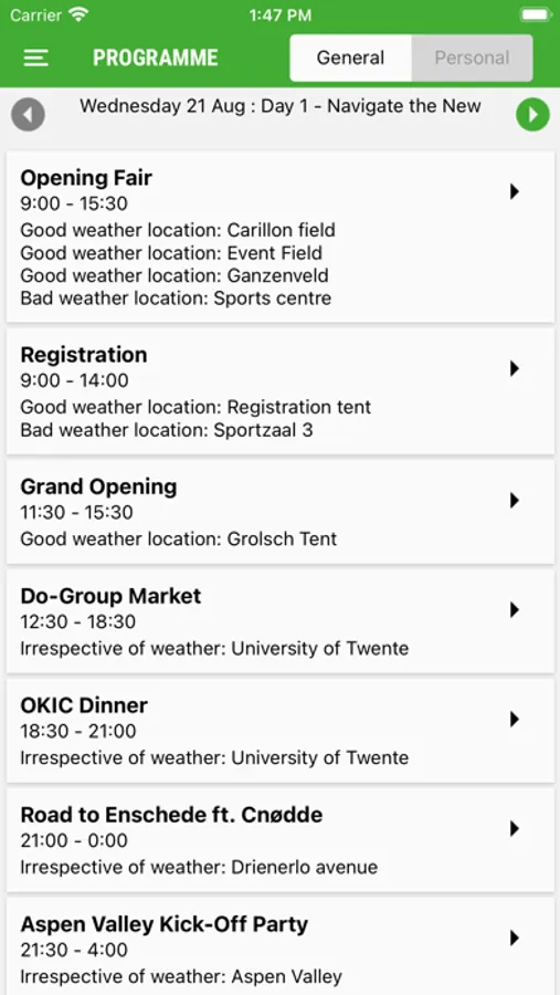 - Programme information: View your own personal programme when logged in, or select a general program to view.