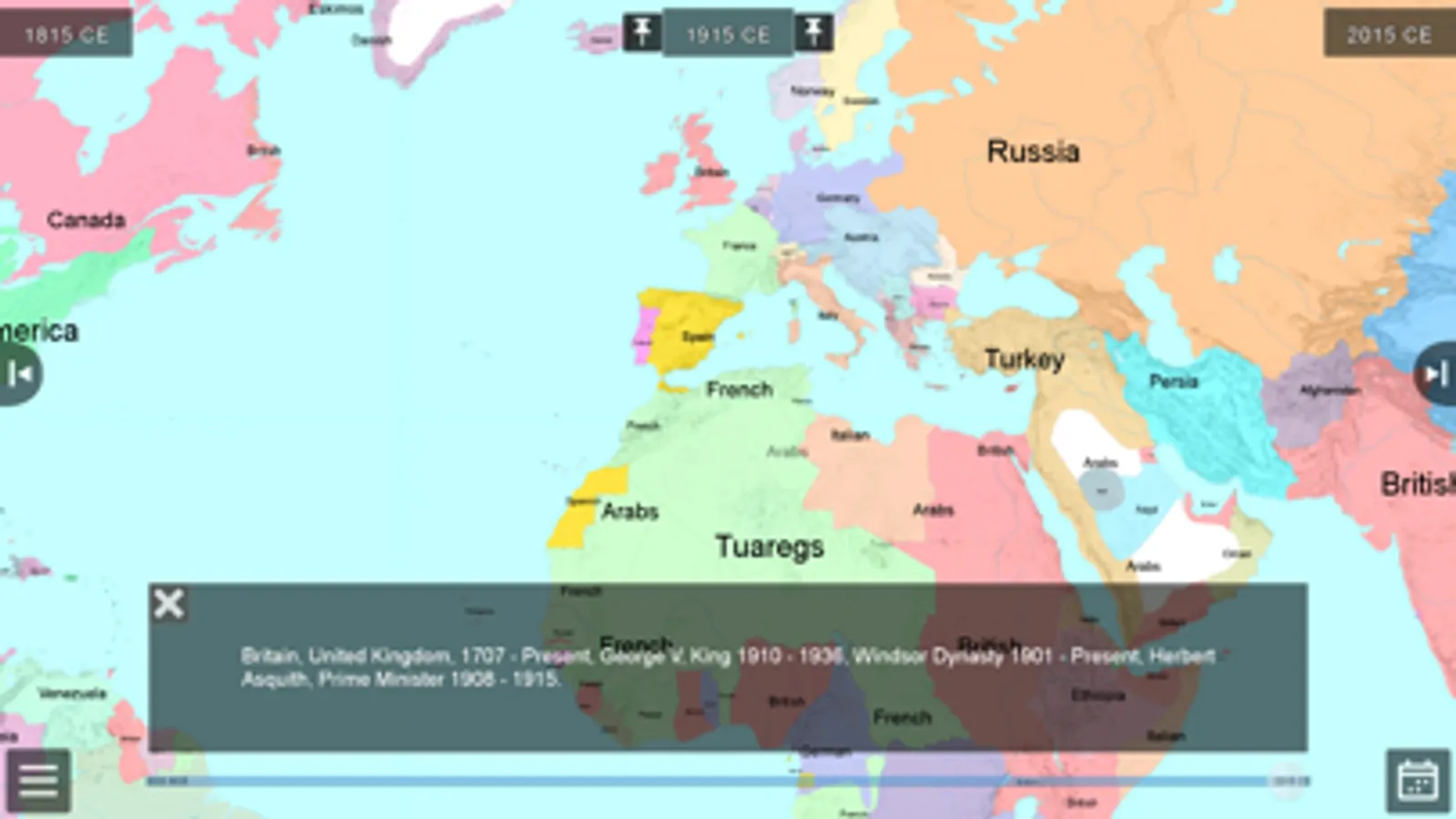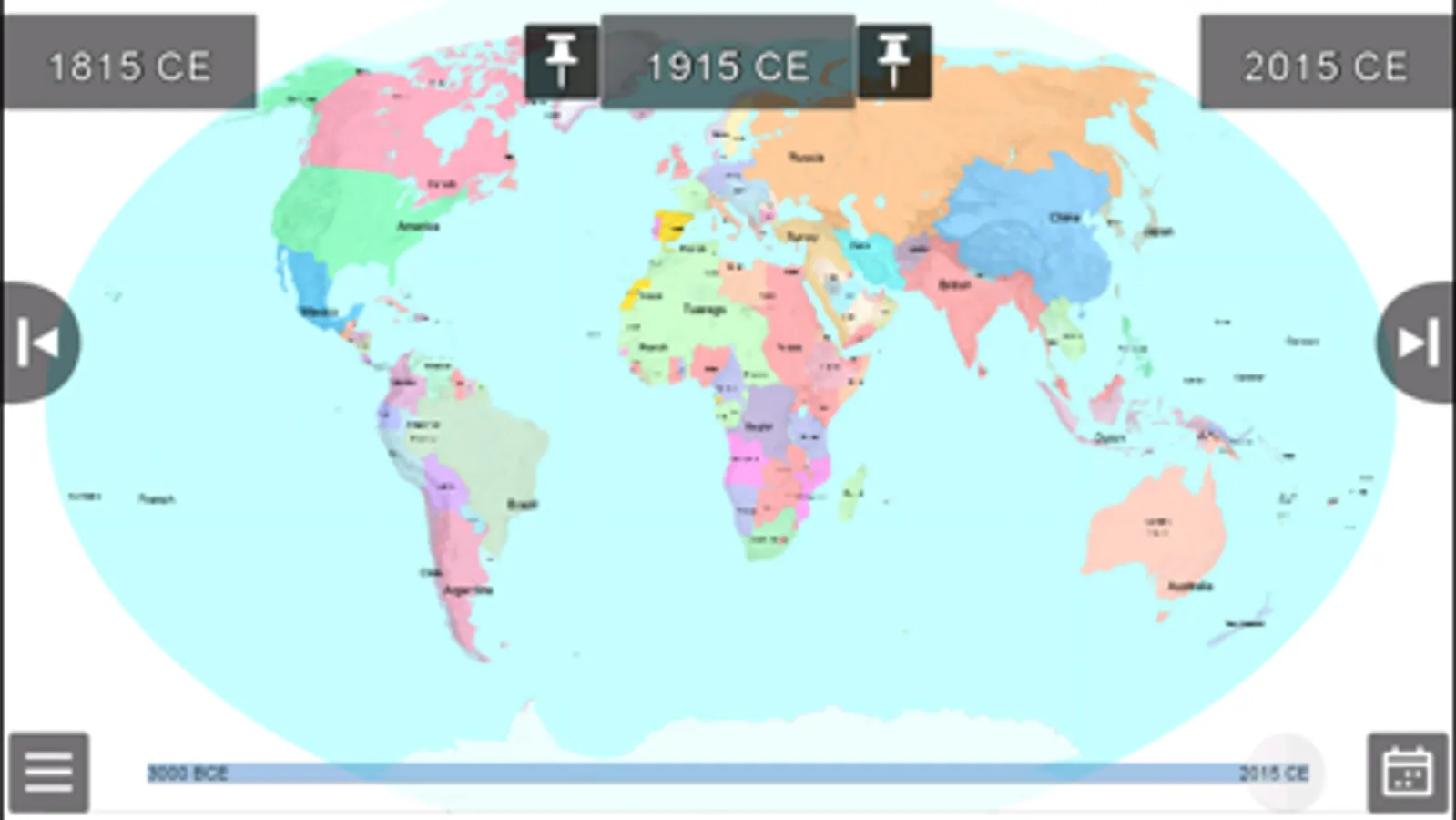 World History Maps: The World, by World History Maps Inc, is a new and unique way of looking at history. Instead of an historical atlas which has maps showing the world (or a region) at a few significant years, or maps that try to compress decades or even centuries of change on to one map, we offer a different approach. Our interactive historical maps show the entire world for every single year in recorded history. This is an unprecedented amount of detail in time for the whole world that cannot be found anywhere else. The scalable maps allow even the smallest countries to be shown. Looking at History in this detail gives one a unique perspective. These are also the first historical maps to be made using GIS technology. Maps show countries of the world at the beginning of each year, with Major Tribes and Peoples. Maps are Scaleable and zoomable with popup information. Scrolling forward and backward is available with adjustable speeds. Maps can be pinned so you can toggle back and forth to compare different years. Following below are more details about how to use the apps.