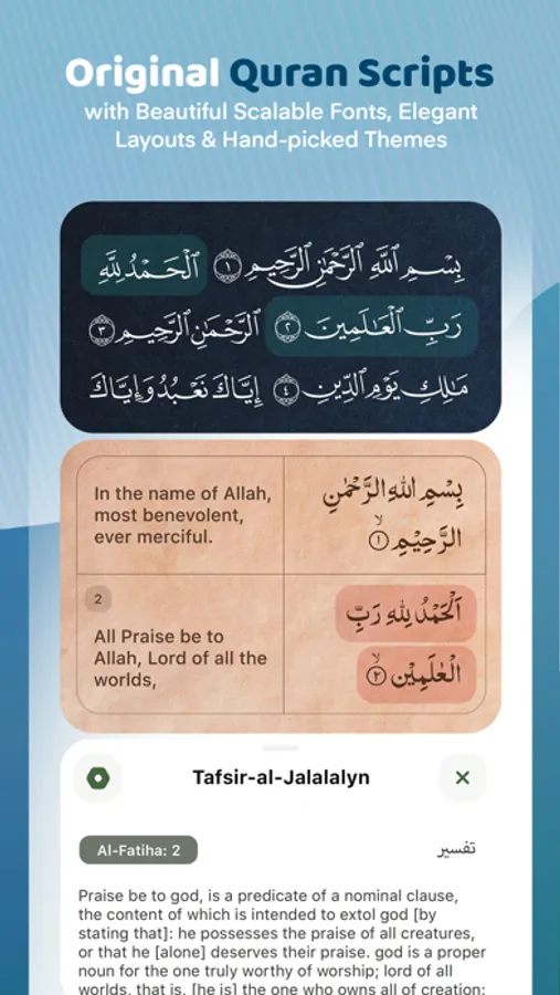 - 60+ most authentic Quran Tafseers from renowned scholars in English, Arabic & Urdu languages.