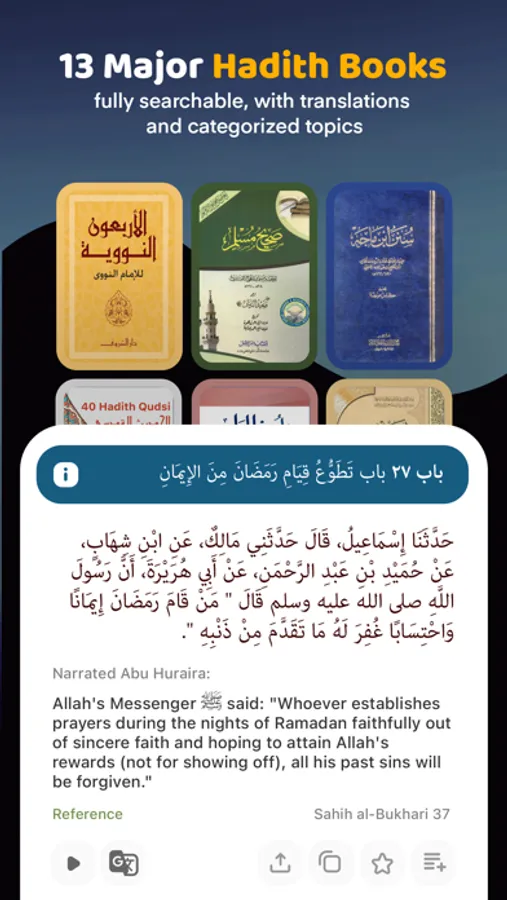 - 'Hadith Collection' section, containing complete Arabic Hadiths text & their translations for the following Hadith books: Sahih al-Bukhari, Sahih Muslim, Sunan an-Nasa'i, Sunan Abi Dawud, Jami` at-Tirmidhi, Sunan Ibn Majah, Muwatta Malik, 40 Hadith Nawawi, + more. Hadith section also supports searching.