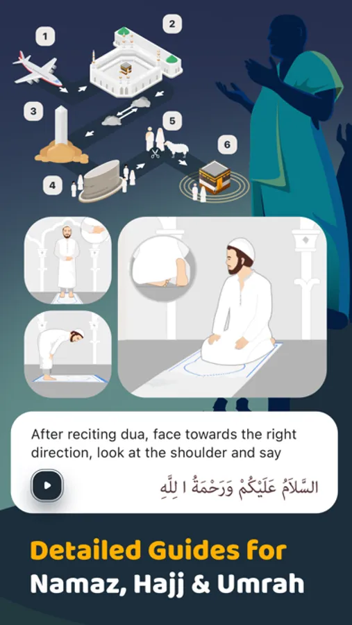 - "Hajj & Umrah Guide" section, with detailed instructions for Hajj & Umrah performance. Also contains a comprehensive guide about the historical places to visit in Mecca & Medina
