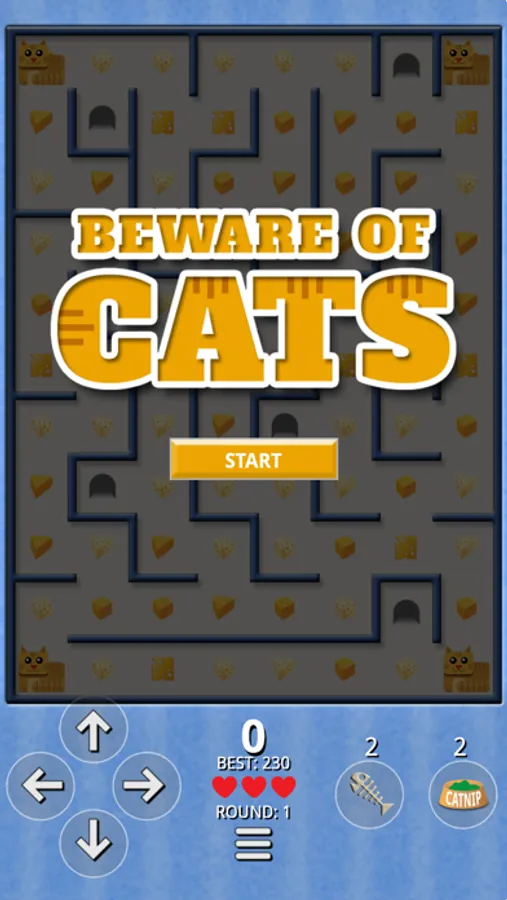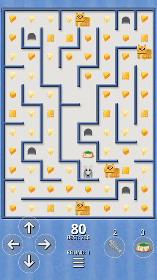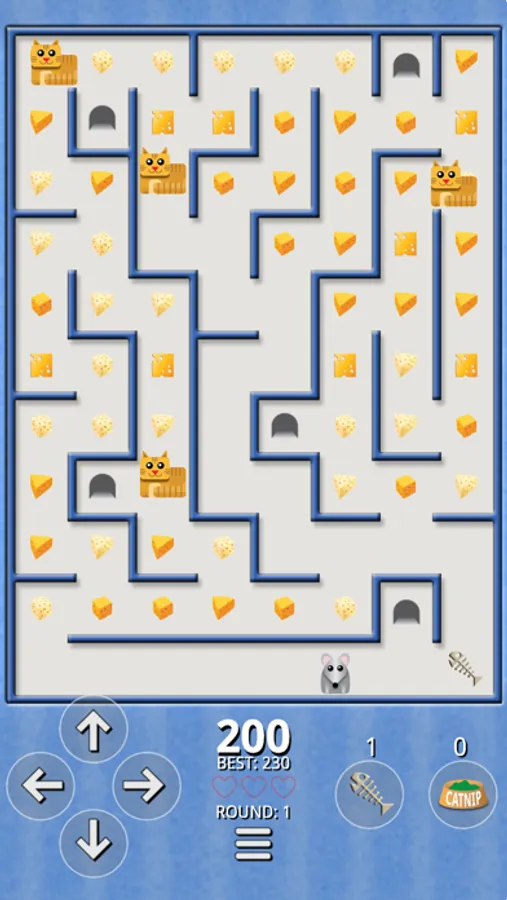 Guide the mouse through the maze collecting the cheese and avoiding the cats. Tapping a direction arrow will move the mouse in that direction until it comes to a wall or until you tap another arrow which will move it in that direction the next time it can. Once you have collected all of the cheese you can progress to the next round. You can deploy fish and catnip to help defend against the cats. When a cat runs into a deployed fish he will stop for a short time to eat it. If a cat runs into a bowl of catnip he will eat it and become harmless for a short time which is indicated by it becoming transparent. In the maze there are five mouse holes which can transport you to another mouse hole. Two always take you to the same place and the other to a random mouse hole. As you progress through the rounds the cats get smarter. Sometimes an extra fish or catnip appears in the maze which you can collect to use. You have three extra lives to use during the game but once they are gone you have to start from the beginning again.