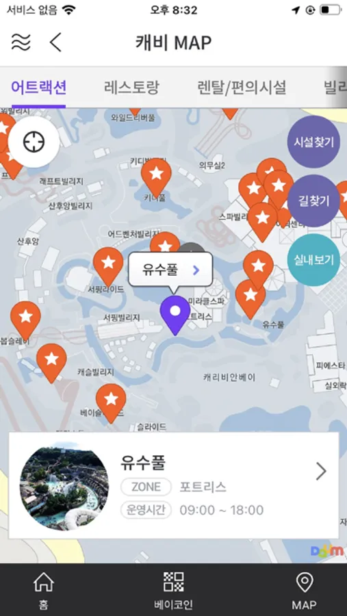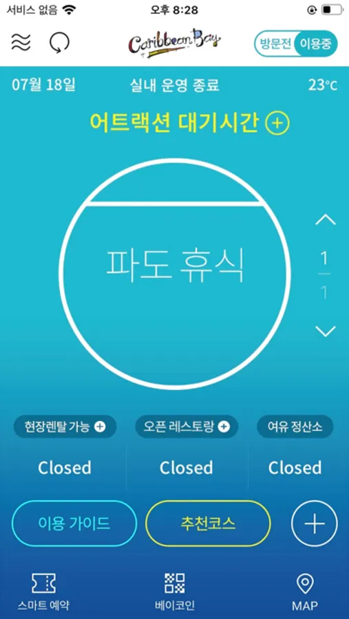 이용중 모드 : 대기시간, 파도 상황, 렌탈가능 품목, 여유 레스토랑 등 캐리비안 베이를 알차고 편리하게 즐길 수 있는 정보 총출동