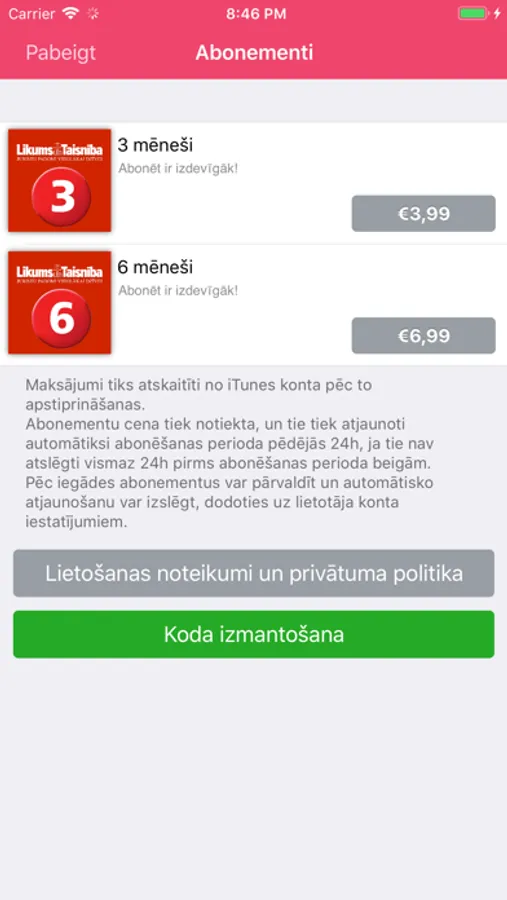 * Maksājumi tiks atskaitīti no iTunes konta pēc to apstiprināšanas. Abonementu cena tiek notiekta, un tie tiek atjaunoti automātiksi abonēšanas perioda pēdējās 24h, ja tie nav atslēgti vismaz 24h pirms abonēšanas perioda beigām. Pēc iegādes abonementus var pārvaldīt un automātisko atjaunošanu var izslēgt, dodoties uz lietotāja konta iestatījumiem.