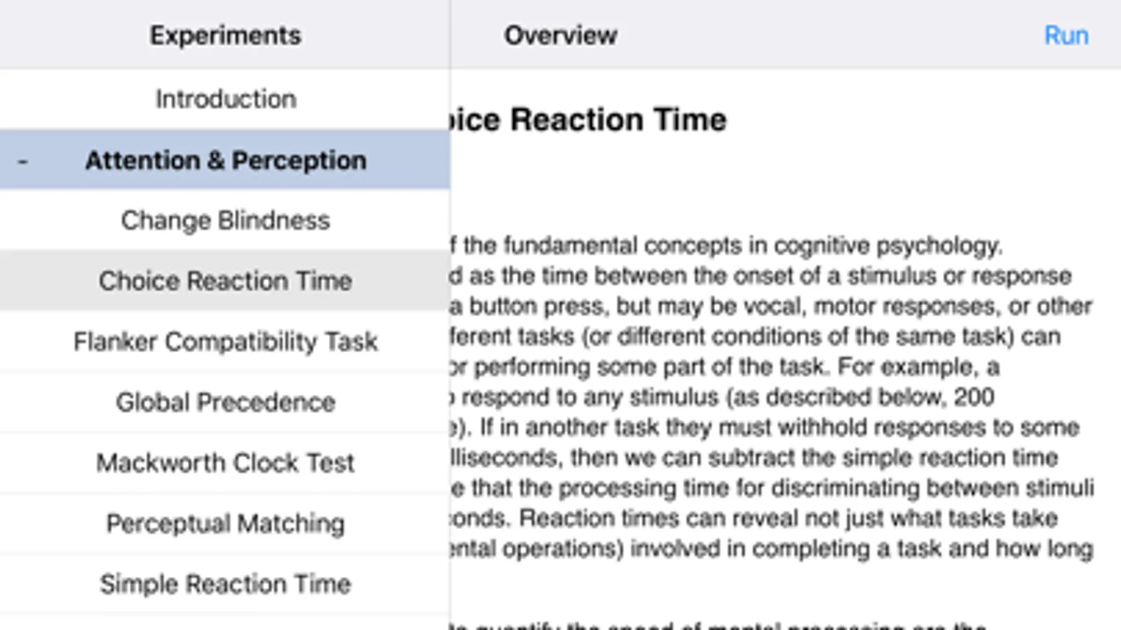The perfect companion to any introductory psychology course, Psych Lab 101 contains 35 well-known cognitive and clinical psychology experiments you can try yourself. See how you compare to classic results - figure out how long it takes to mentally scan through groups of objects in the Sternberg scanning paradigm, see if words are recognized faster than letters in a word superiority task, try to spot subtle changes in the change blindness paradigm, and much more!