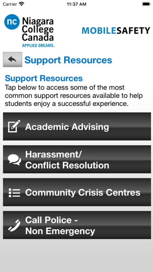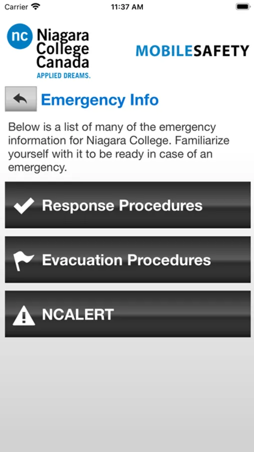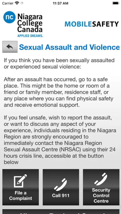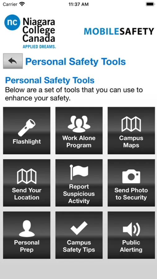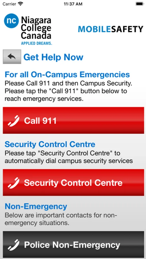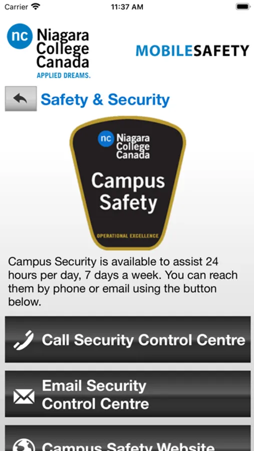 Niagara College Mobile Safety is an app developed for students and staff at Niagara College by Campus Security Services. The app features include quick access to Campus Security, a personal safety toolbox, campus maps, on-campus support resources, and more!