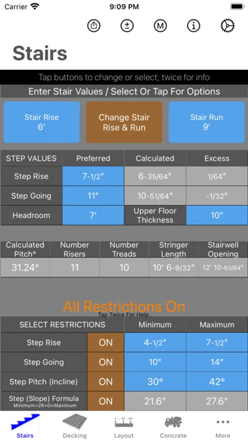 In addition to handling multiple restrictions simultaneously Staircalc also allows for situations where the overall stair rise is fixed or the stair run is fixed or both rise and run are fixed allowing maximum flexibility.