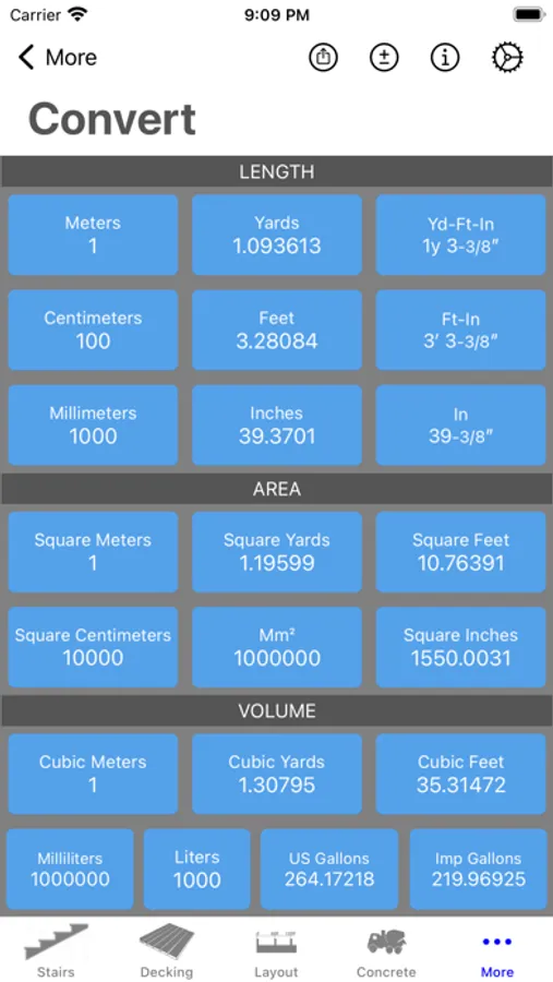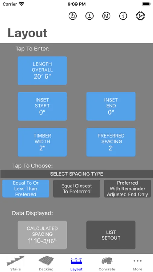Metric or US/Imperial (feet, inches - decimal or fractions) tap icon to change.