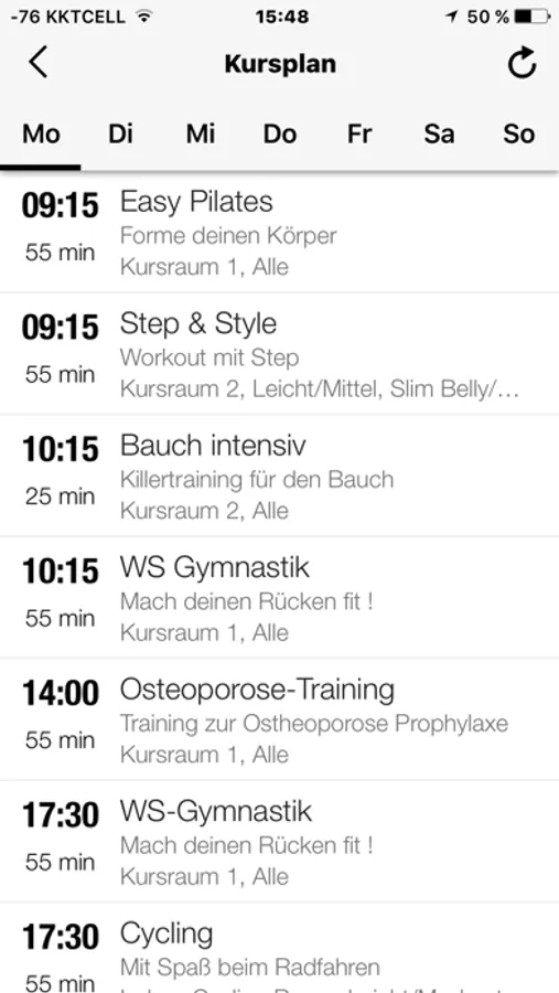 Direkter und aktueller Zugriff auf den Gruppentrainingsplan: Für jeden Kurs können Sie Details wie Ort, Zeit und Kursbeschreibung einsehen.