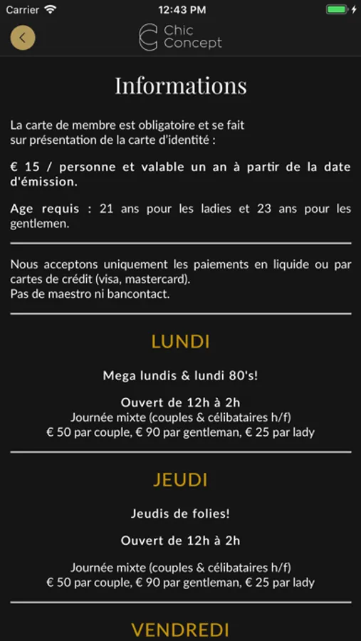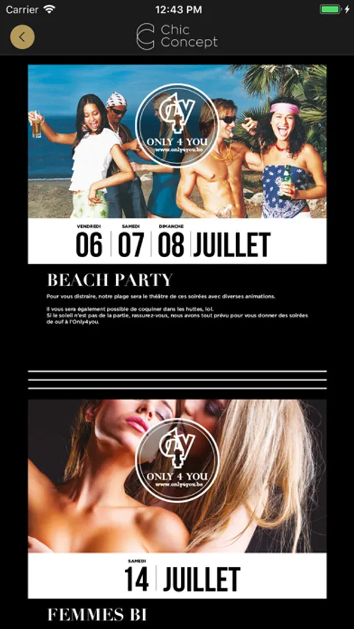 L’Only4You à Fontaine-Valmont, en Belgique, Ouvert à la clientèle mixte le lundi et le jeudi de midi à 2h, le vendredi de midi à 4h ainsi que le dimanche de 15h à 2h. Le samedi est réservé aux couples, de 15h à 5h. Tarifs : 85 € pour un homme seul ; 40 € pour un couple le lundi et le jeudi, et 60 € le vendredi, 90 € le samedi, 50 € le dimanche. Carte de membre obligatoire : 15 €.