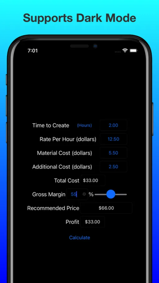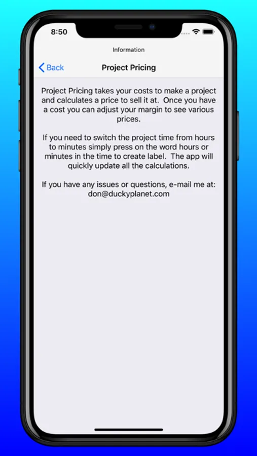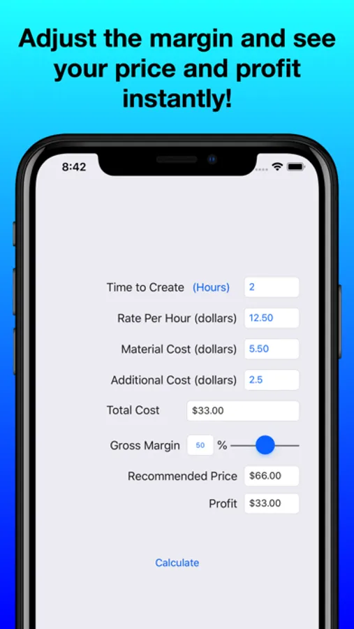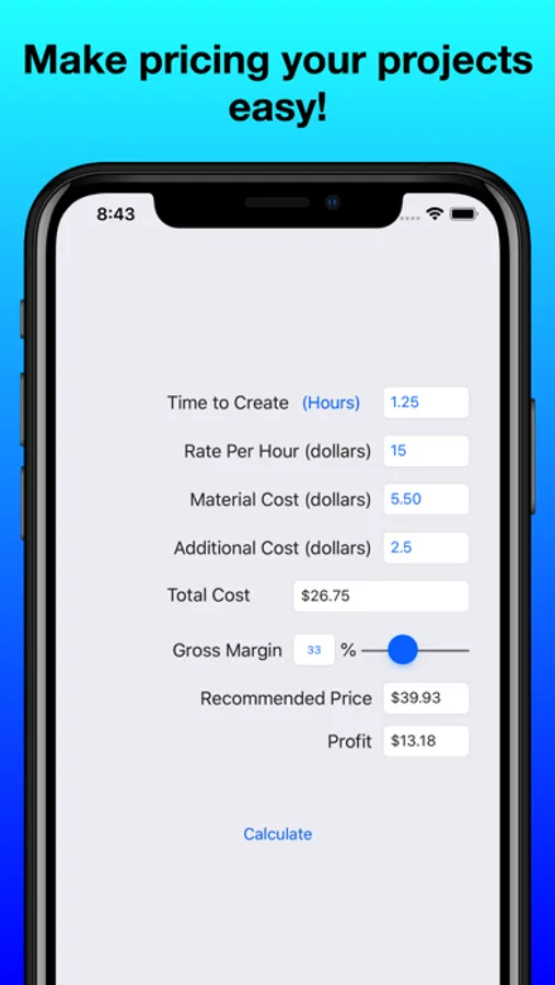 The app allows you to put a length of time to construct the project, the amount per hour you want to get paid, material cost and other costs you may have. Using that information it will come up with your total cost. Using the cost, you set a margin and it will tell you the price you should charge along with the profit you will make.