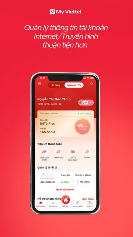 Tra cứu chi tiết thông tin tài khoản, gói cước đang sử dụng: Di động, Internet, Truyền hình... Đăng ký gói cước Data, Thoại, SMS với nhiều lựa chọn và nhanh chóng chỉ với một chạm.