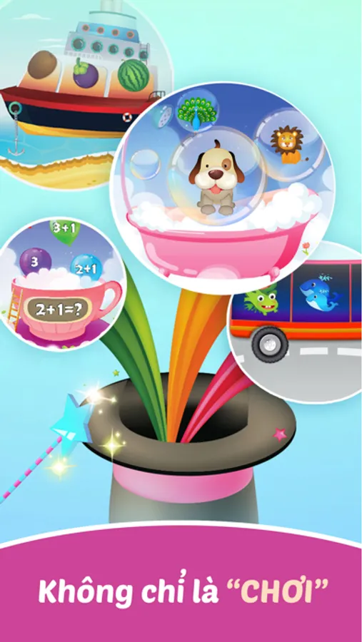 + Chữ cái, số đếm, màu sắc, hình khối, hoa quả, động vật, rau quả