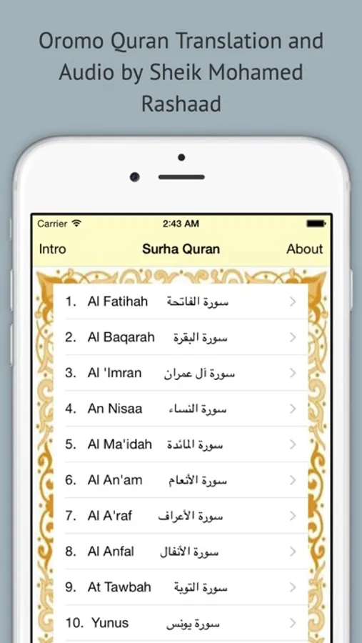 Quran Oromo is the best way to learn Quran using your powerful Apple mobile device. You be able to read and/or listen Quran verses in Arabic and their respective translation in Oromo language.