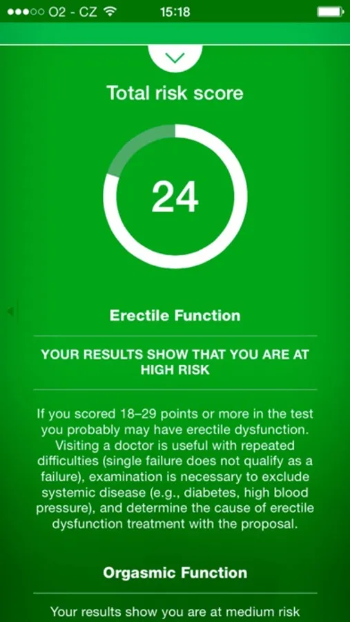 The ED Test is a risk calculator for developing erectile dysfunction covering areas of erectile and orgasmic functions, sexual desire and intercourse satisfaction. After completing a brief questionnaire, you would quickly learn the potential risk of developing this disease. We introduce a user-friendly application which excels in its simplicity of use and is a great aid in preventing impotence.