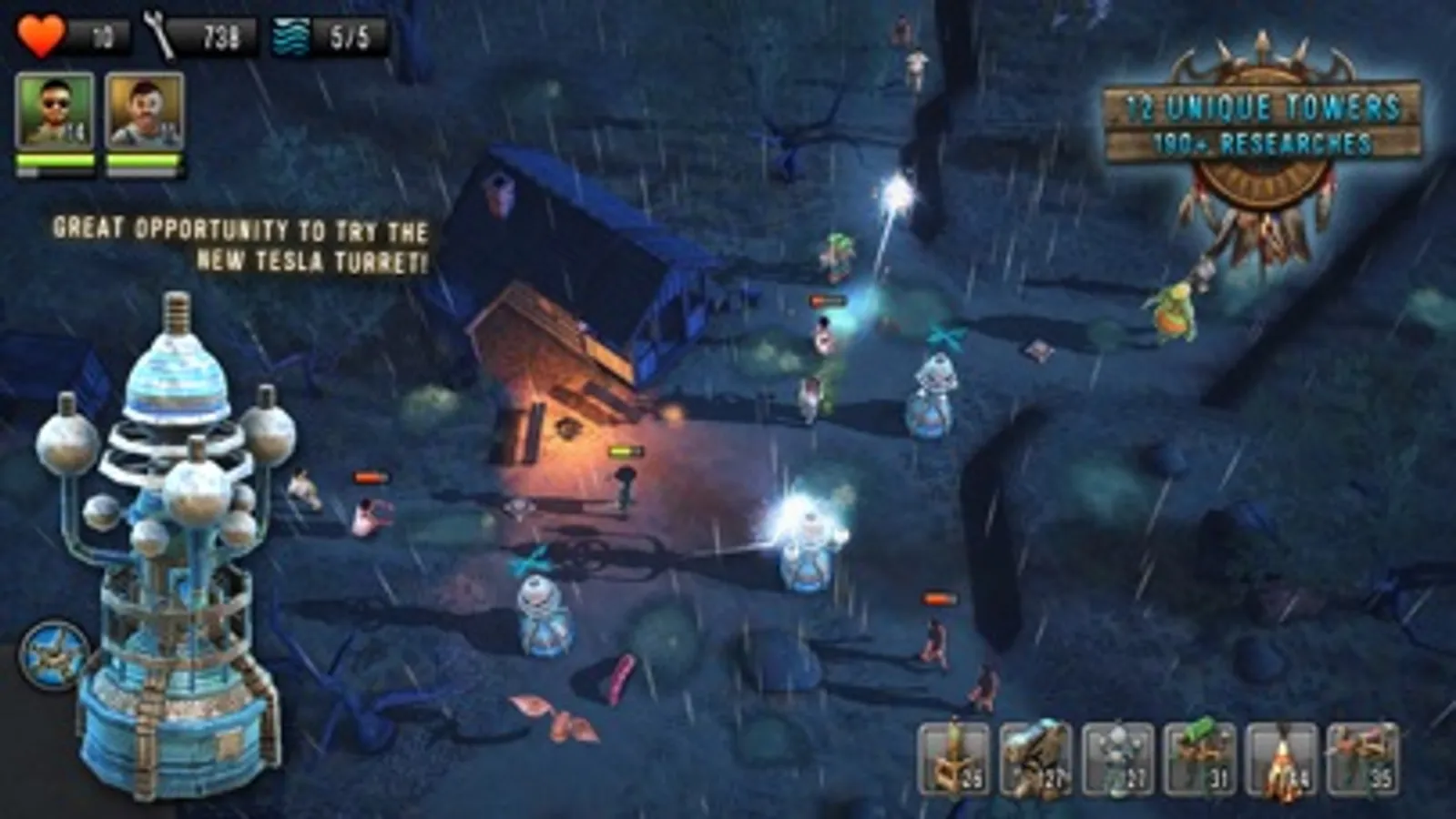 - 12 Different Towers to defend yourself with, each with a unique research tree to make them even more powerful! Pierce the zombies with arrows from an Arrow Tower, blow them to pieces with a Mortar Tower or electrify them with a Tesla Tower.
