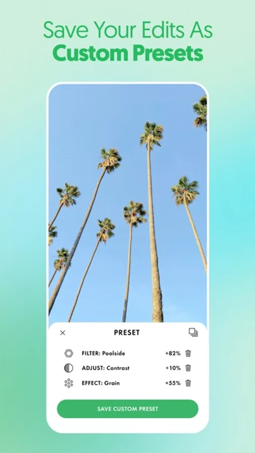 • Create your own editing presets, based on your favorite filters and effects