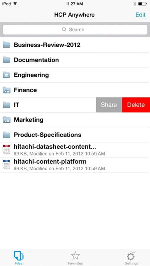 Simply put a file into HCP Anywhere and it is immediately available on all your devices via the cloud. Mark files as favorites and they will be stored on your mobile device so you can work with them when you are not connected to the Internet. Share files or entire folders with fellow employees, or audiences outside your organization safely and securely. The data is stored within your IT organization rather than in an outside cloud.