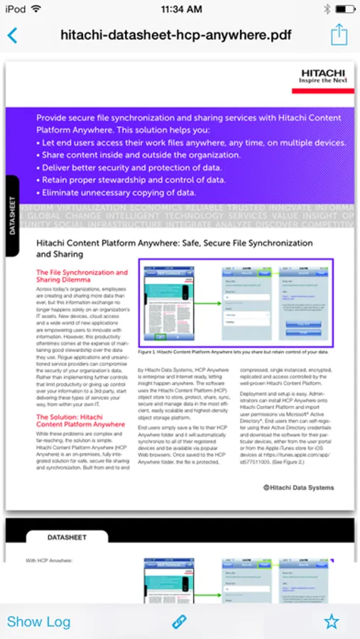 With your files stored in Hitachi Content Platform Anywhere, your data is automatically protected, preserved, secured and managed throughout its lifecycle and is always available. Lost your mobile device? Replace the device, download this app and all your data is back. No restores, no system checkpoints, no calls to the helpdesk; just you, your device and your data. Hitachi Content Platform Anywhere makes life easier: No more full email inboxes, no more wrestling with heavyweight content management applications, no more struggling to share large files. Just put the file into Hitachi Content Platform Anywhere and it will be available securely anywhere, at any time, on any device, and easily shared via a link rather than sending the entire file.