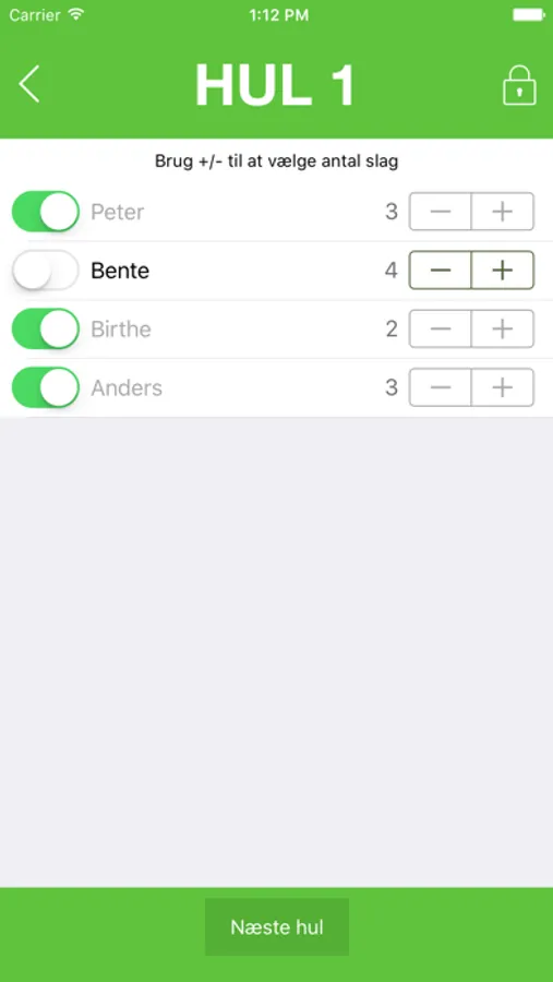 - Se hvor mange slag hver spiller har brugt for hvert hul