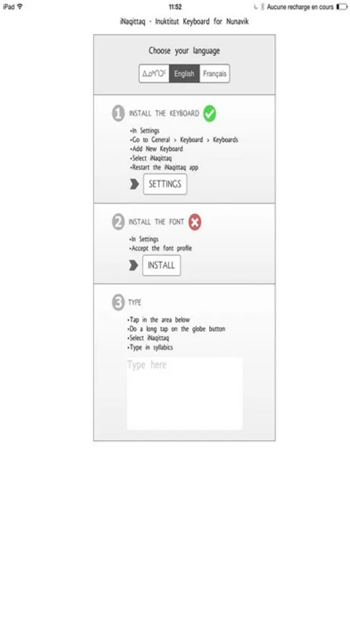 The Nunavik syllabic keyboard layout is based on the IBM Selectric typewriter layout of the 1970s and the Macintosh (US-System 6) layout. The Nunavik keyboard layout provide a consistent keyboard mapping for syllabic characters regardless of the computer platform or encoding. Our Nunavik keyboard has been very popular on Mac OS and Windows for several decades. Any user who is familiar with those will instantly be able to use their typing skills on an iPhone, an iPod or an iPad.