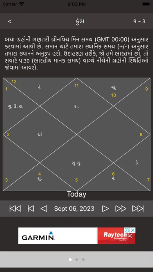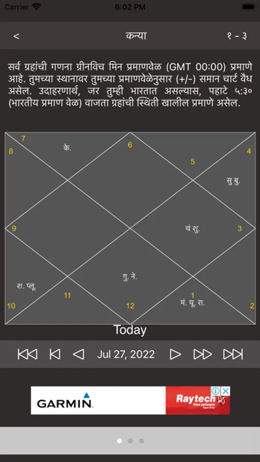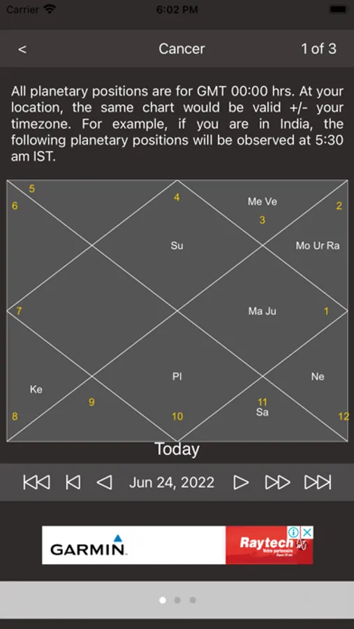 Use an animated view to observe how a planet (ग्रह) moves around in your birth chart and when it retrogrades (वक्री) in your Kundali. The animated view makes it easy to understand the time periods in which a planet moves through different houses (भाव) in your birth chart. You can also look at the timeline of each planet to know how much time it has spent in its current house as on today and the corresponding transit dates to the next house.