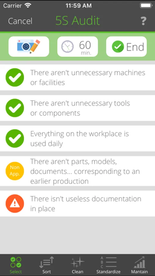 • Perform a 5S audit composed by 5 big families of 5 questions each for a total of 25 questions which will guide you through your research of improvement.