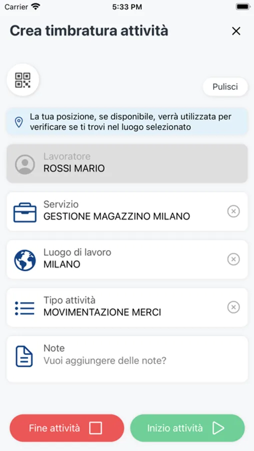 Ciascun dipendente può inserire la propria presenza o attività selezionandola tra i clienti/servizi/luoghi messi a disposizione da Geobadge. In alternativa, può scegliere di inquadrare un QR code o avvicinarsi a un tag NFC.