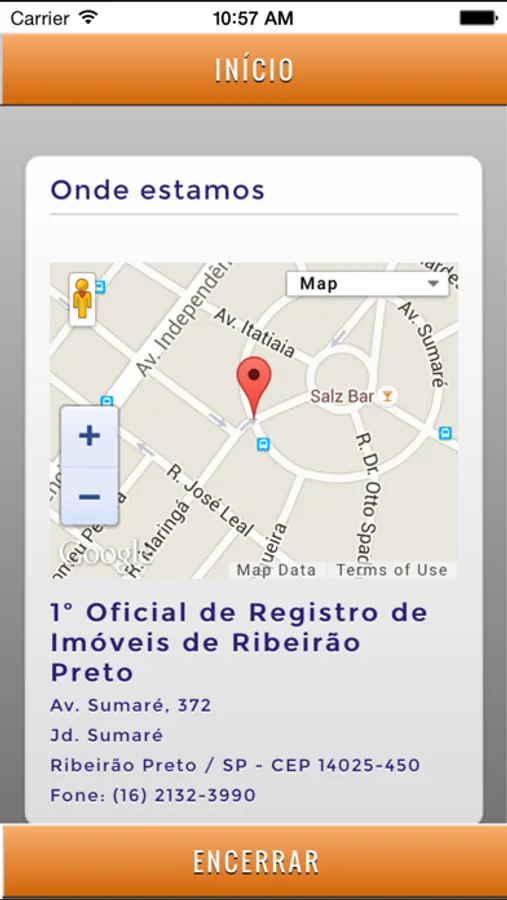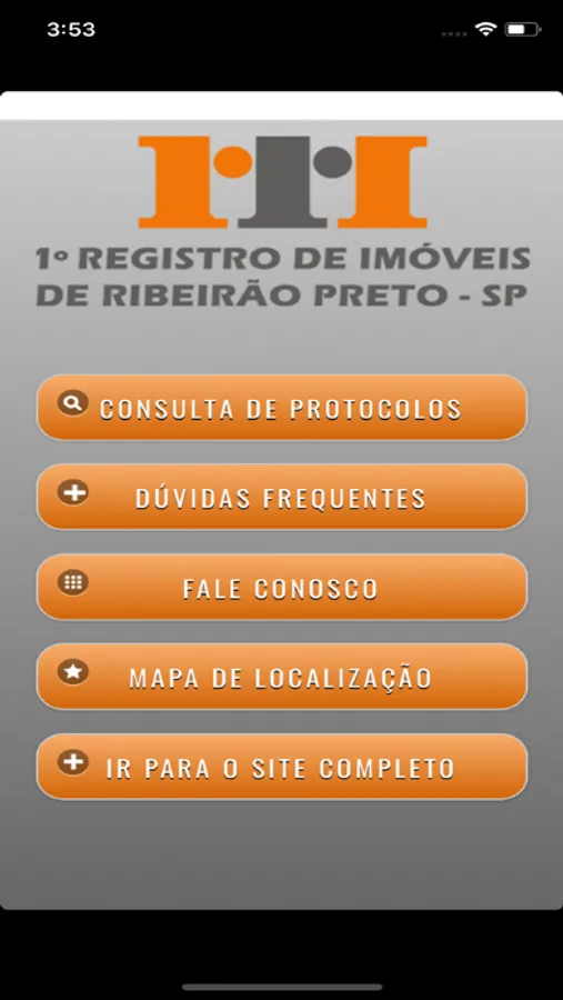 Permite que você consulte o status dos pedidos de Certidão e Protocolos de Títulos além de visualizar no mapa a localização do Cartório, endereço, telefone e também acessar a página do Fale Conosco diretamente em nosso site www.1rirp.com.br.