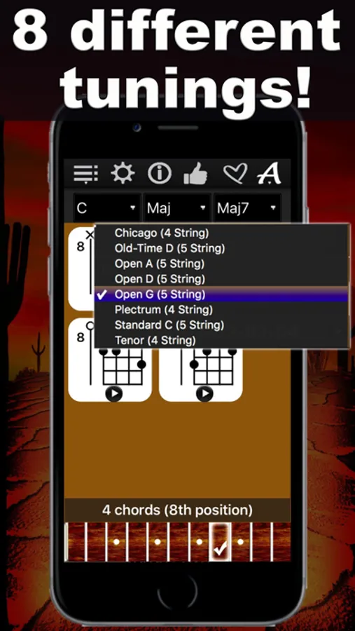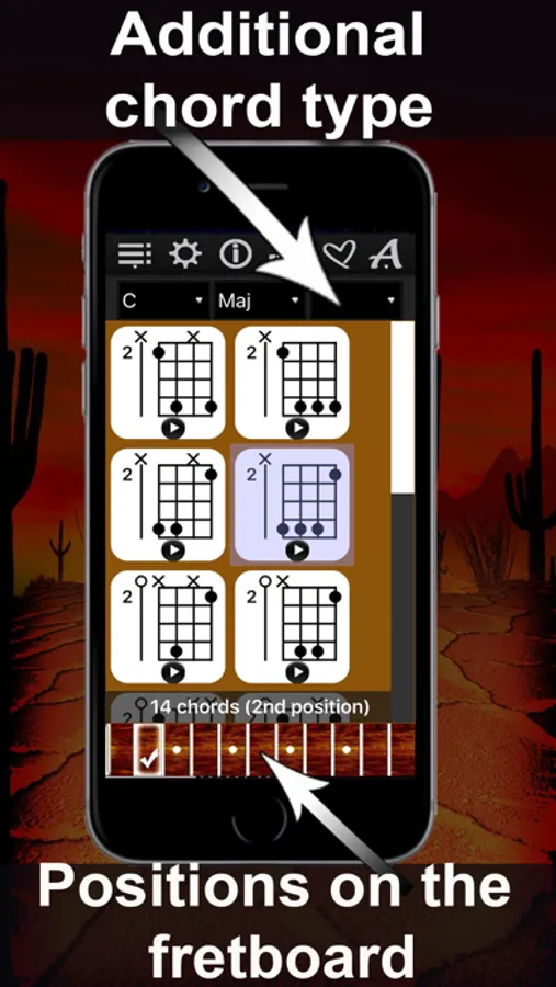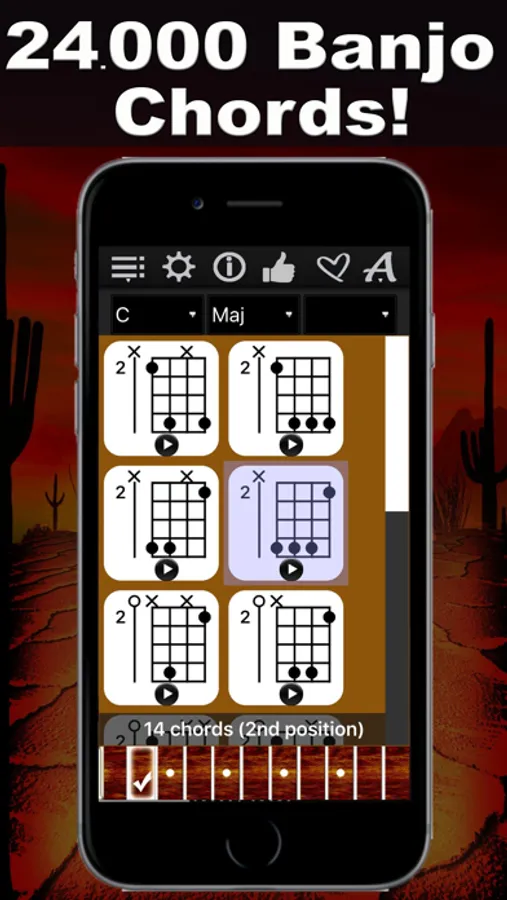 Thanks to a specially developed algorithm, the app will show you chord diagrams with all possible options in all 11 positions of the fretboard. Simply select a chord root on the left, chord type in the middle, the chord type addition on the right, and explore the chords with “Banjo Chords Compass”!