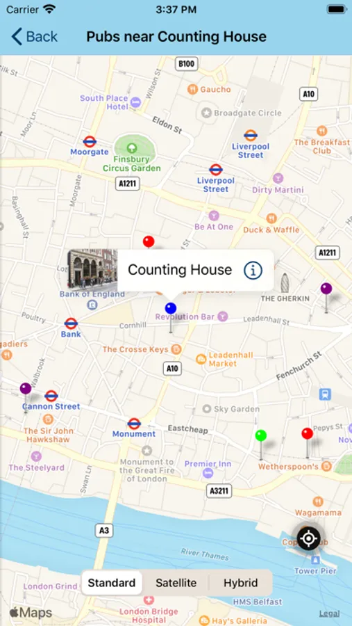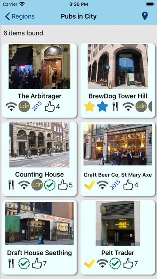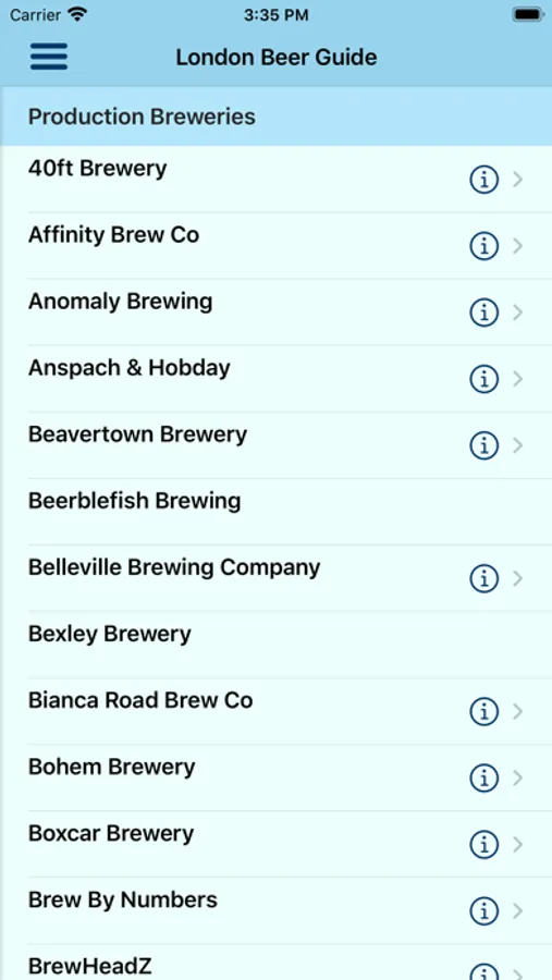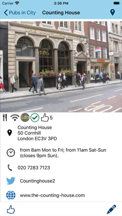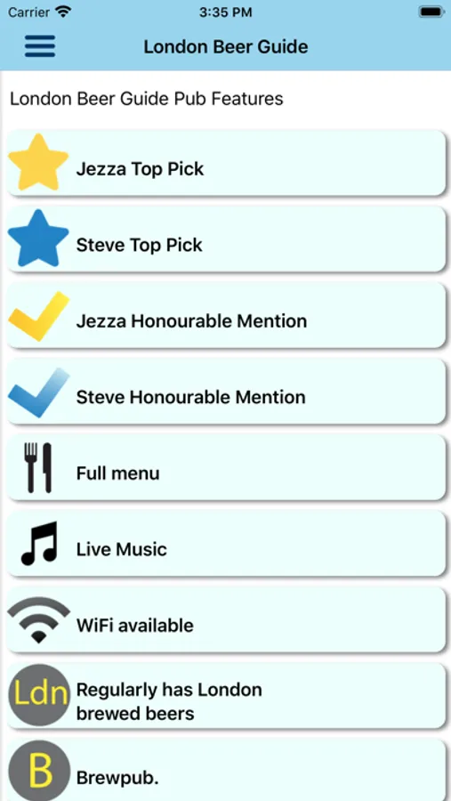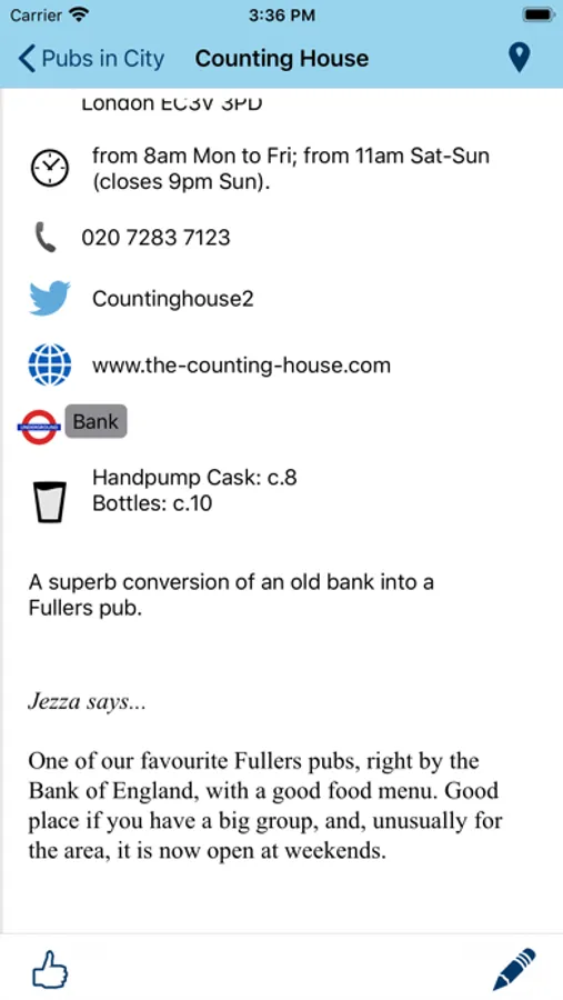 Each entry contains a review, photograph, nearest tube or mainline rail station, contact info, website and twitter handle for each pub. Check the pub's twitter feed for news without leaving the app. A map will show the location of the pub as well as nearby listed pubs.