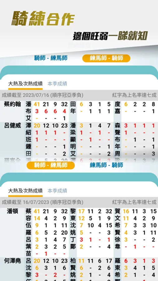 - 《騎練合作》有齊騎練合作、練騎合作成績統計,更有針對大熱及次熱的合作數據,助你運籌帷幄。