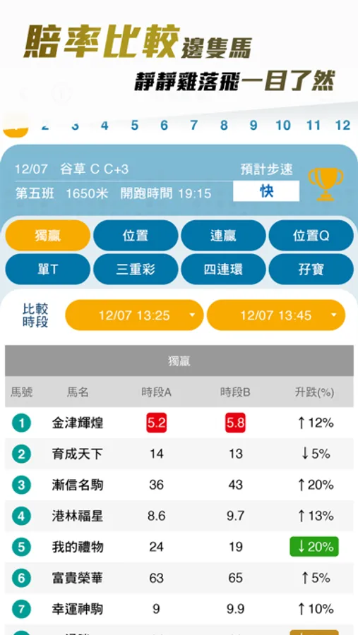 - 《賠率比較》:用戶可自行調校時間,比較馬匹每段時間的賠率變化。