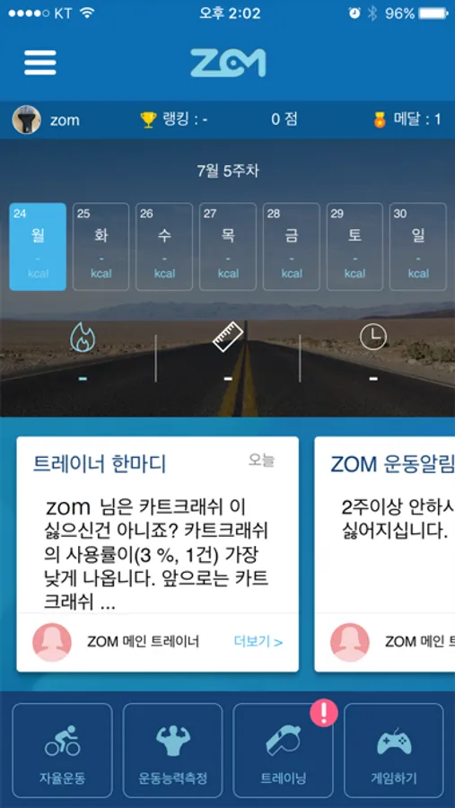 Riding with a 'Z-Bike', customized training, and managing the movement history, including games, shows calories burned based on the rankings.