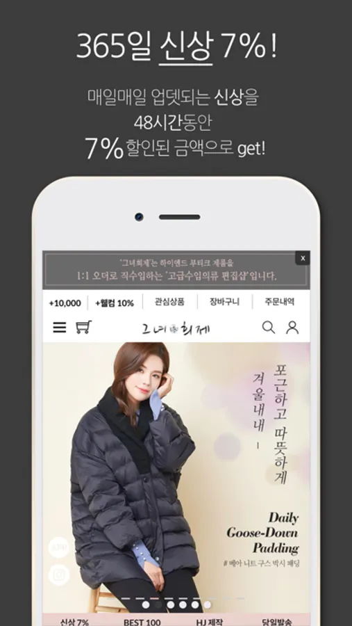 그녀희제 쇼핑몰앱은 스마트폰으로 언제, 어디서든 편하게 쇼핑을 즐기실 수 있는 쇼핑 전용 어플리케이션입니다. 특별한 나만의 스타일을 원하는 여성을 위한 코디 제안과 앱을 통해 빠른 신상 정보와 다양한 혜택을 즐기실 수 있습니다.