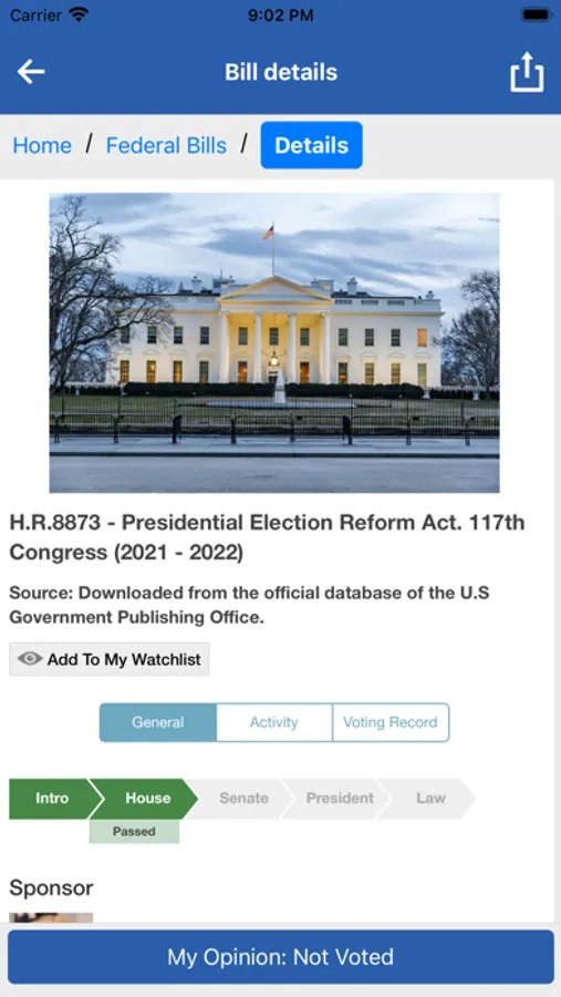 Note that content for Bills and Executives Orders comes from official government data sources. Please refer to Disclosures in the Settings menu to read more about content sources. Please update the app if you do not see Disclosures selection in the Settings menu.