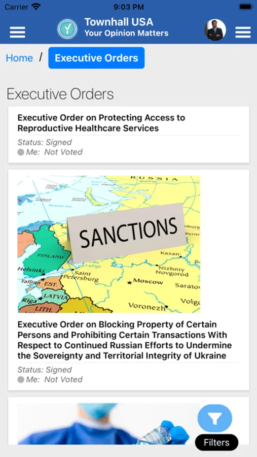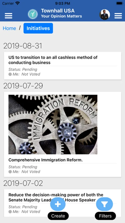 We aim to empower our members by aggregating individual user votes into a powerful voice that will get the attention of the political decision makers. Using the Townhall USA app or web site, we the people can tell our elected representatives whether we support or oppose the Legislative Bills introduced in Congress, Executive Orders issued by the President, and Initiatives created by the members. On the other side, our elected representatives can get a clear picture of how many members are supporting or opposing the issues by simply opening the app or website.