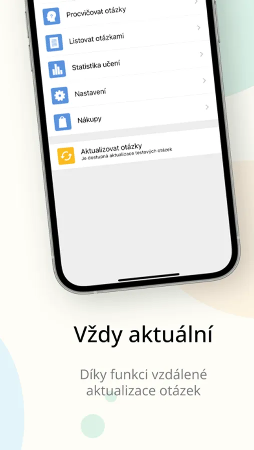 • Aplikace denně kontroluje, zda-li není k dispozici aktualizace testových otázek a případně nabídne aktualizaci, aby byly otázky vždy dle platné legislativy