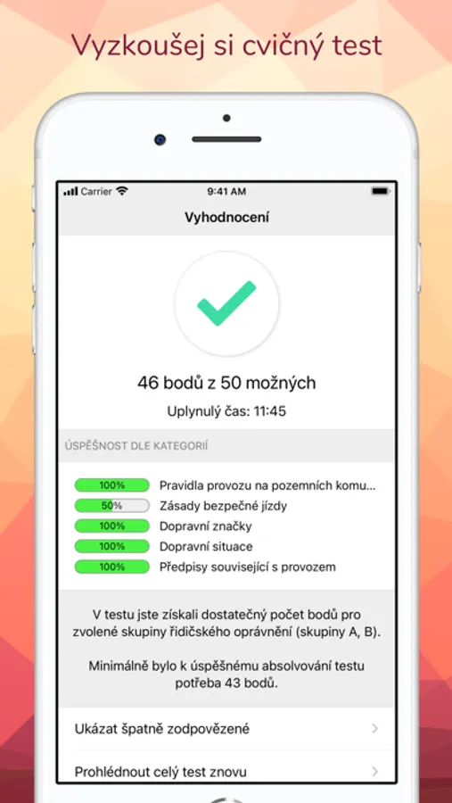 • Možnost ostrého testu s celkovým vyhodnocením a přehledem špatných odpovědí na konci testu