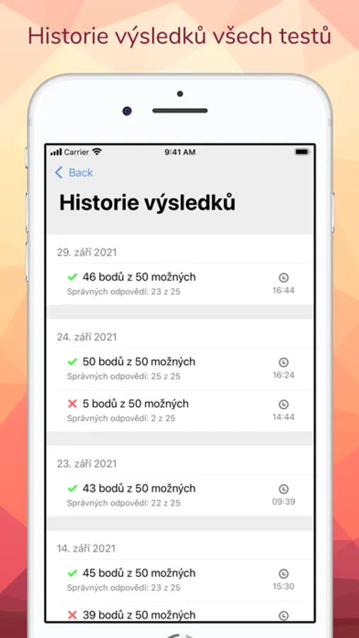 • Možnost prohlédnout si historii výsledků absolvovaných testů