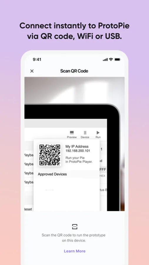 To open prototypes on your iPhone or iPad, connect ProtoPie Player to ProtoPie Studio via WiFi or USB. Or just log in with your ProtoPie account to access your prototypes in the cloud.