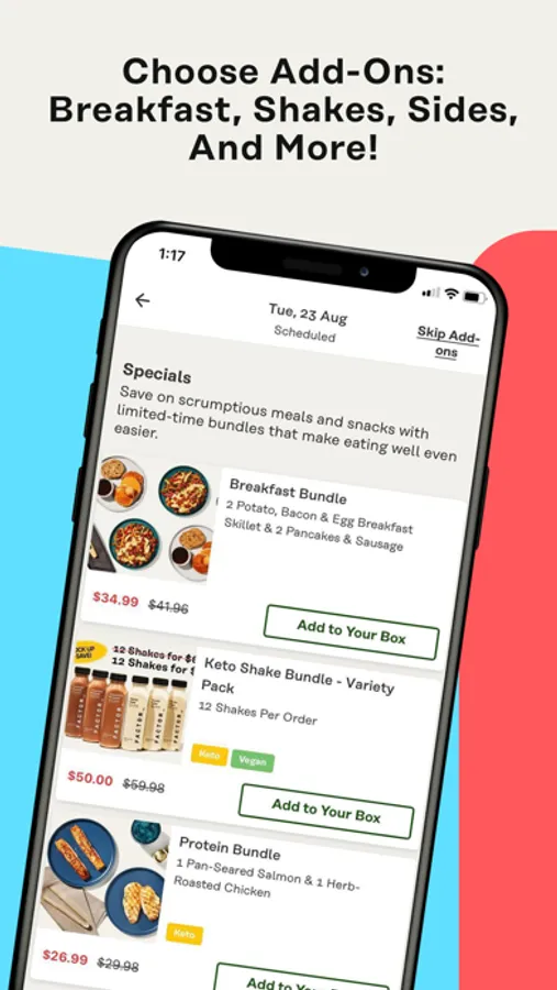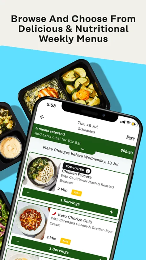 Our nutritious meal plans offer 29+ meals and recipes every week from a rotating menu that feature options from Keto, Vegan, Vegetarian, low-carb, and low-calorie diets. You can also add snacks, drinks and other wholesome add-ons to your food delivery order.