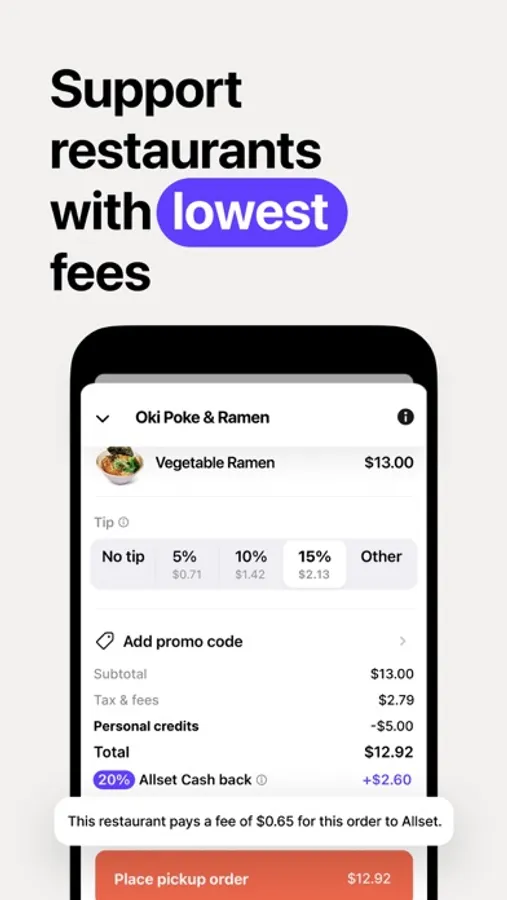 Order ahead for pickup at restaurants and coffee shops in your neighborhood. Get 15% cash back and save on every order with Allset Rewards. Choose from your favorite local foods - salads, burgers, sushi, pizza, and more - just grab-and-go or stay for a quick dine-in.