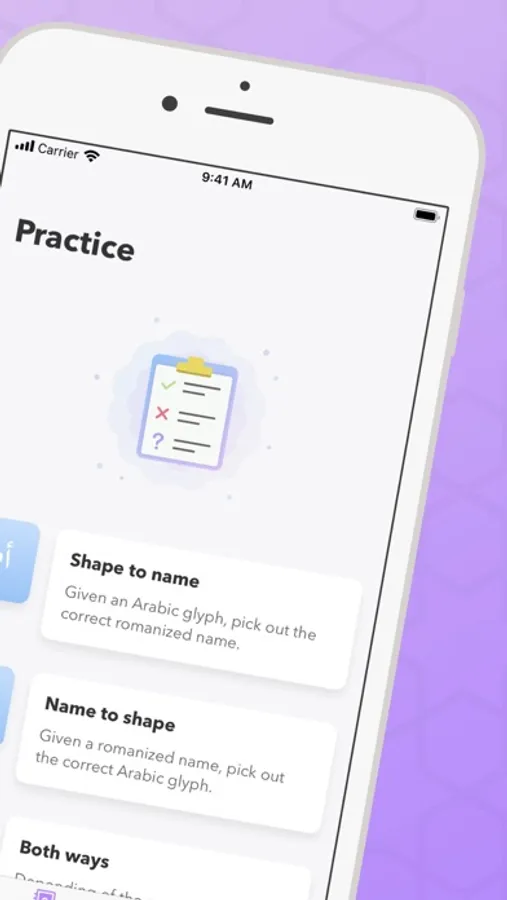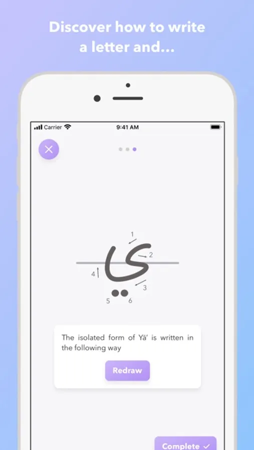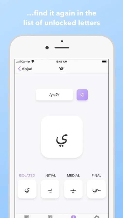 • Letter cards: for each new letter you learn, Abjapp will show you how to pronounce it and how to write it;