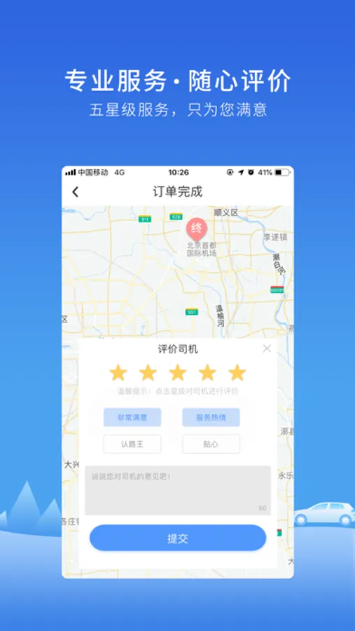 - 请放心享受飞嘀打车的五星级乘车体验。