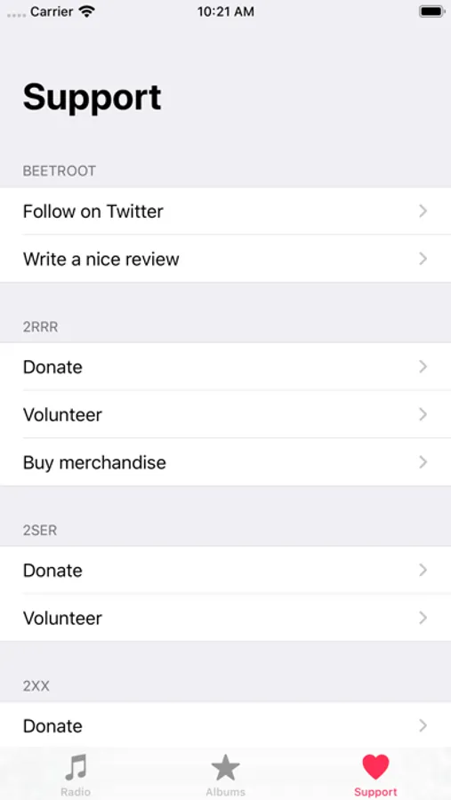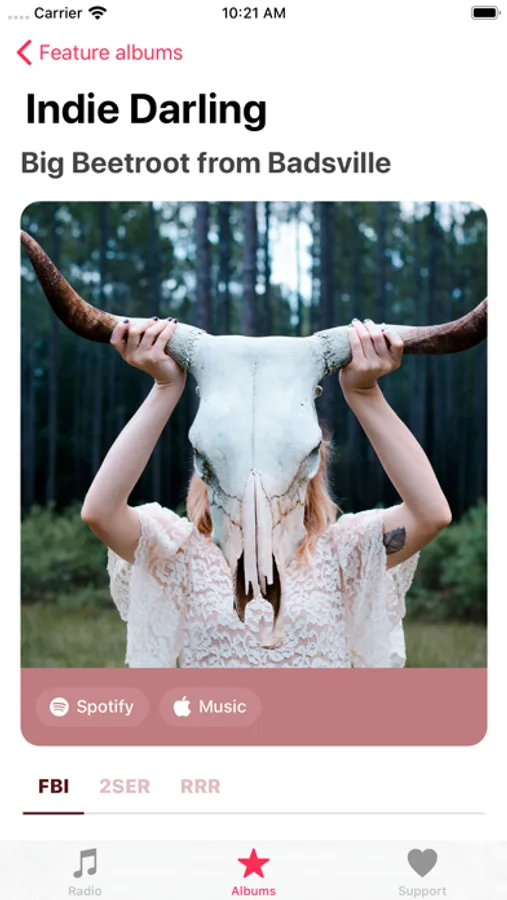 Listen to great Australian community radio like Triple J, Double J, 3RRR, FBi, 4ZZZ, 2XX, PBS, 2SER, Three D, and more! Beetroot'll remember your favourite stations and even recommend new ones based on your home state. Hear a cracking tune? Beetroot's got you covered. Find the artist on Spotify and iTunes, and get tickets to their next gig in one tap.