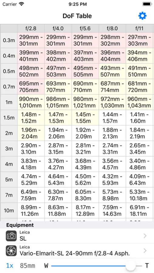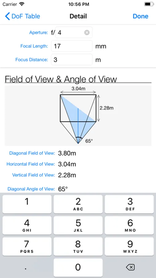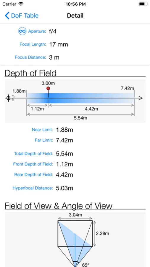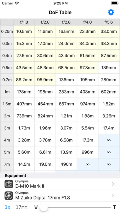 With this app, you don't need to input the parameters (e.g. f-value) by hand because this app shows the result in a table format — you just select the camera and the lens. In addition to that, this app never bothers you by showing DoF values which cannot be achieved by the lens you chose.